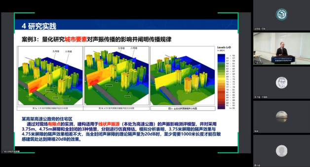 李建军提出的城市声振风险测评研究框架,通过研究振动和噪声的源头特性,揭示声振源特性并提出振源动荷载简化模型;量化分析地形地貌、自然景观和建筑等城市规划要素对声振传播的影响,阐明声振传播规律;建立振动和噪声强度预测模型——对给定场地由城市交通引起的振动峰值响应及噪声强度分布的预测方法,并图形化绘制出等振线和等噪线。再综合运用社会学调查分析、实测、实验等方法,通过研究城市交通声振对精密仪器、精密设备、历史建筑、动植物生态环境,以及对人们生活、工作及身心健康的影响、损伤和干扰程度,识别不同功能对城市交通声振的耐受限值(具有差异性),进而搭建适应城市交通声振环境的城乡规划理论。其研究将噪声和振动一体化思考,建立了声振一体化风险评估模型,综合考虑交通声振风险的多源性、复杂性。会上报告了“基于精密仪器需求的校园声振风险测评与规划响应”“基于人居环境提升的住区声振风险测评与规划响应”“量化研究城市要素对声振传播的影响并阐明传播规律”“高速地铁线路对沿线功能区的声振影响测评”“声振一体化风险评估模型”等多项研究成果。在“基于精密仪器需求的校园声振风险测评与规划响应”研究中,鉴于学校拟在一个长边临规划拟建地铁线路、距离地铁线路最远约600米的狭长地块,布局发展新材料、新装备、新制造等新工科以及生命科学等领域,对实验室和实验设备具有高、精、尖的要求,李建军研究团队通过建立模型,对拟建地块未来声振环境进行全域声振仿真预测,识别出声振放大区,并发现若不采取措施,地铁线产生的振动速度级在全地块范围内将远超过精密仪器容许的限值,无法满足学校布局发展新材料、新装备、新制造等新工科以及生命科学等领域对实验室和实验设备提出高、精、尖的要求。因此,为提高校园整体声振环境品质,研究团队在规划层面提出两项减振降噪措施:一是在临地铁线一线设置综合声振隔减带,对地铁引发的声振的传播路径施加干扰,改变地块内的声振强度分布,整体上降低地块的声振强度,消除放大区;二是基于使用功能,研判拟建建筑对声振的敏感性差异,根据差异性布置在采取措施一之后的适宜的声振强度区。其余数项研究均通过对现场有限点的实测,建构适用于其所在区域的声振测评模型,通过对大型居住区、城中村、酒店群等地区进行声振分布仿真预估,所建构的模型可以通过声振仿真技术,准确可靠地预估整个区域的声振风险,为区域内的后期项目规划提供依据,并指导已建部分的更新改造。